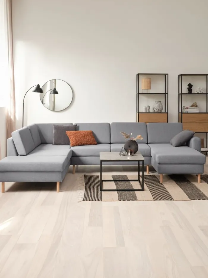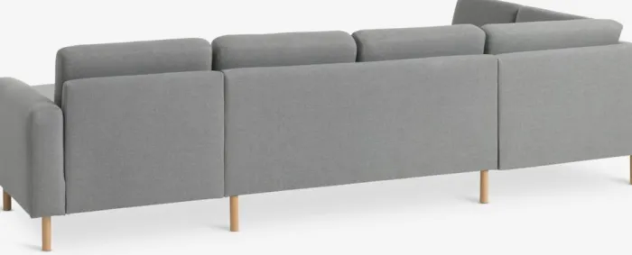 6-personers hjørnesofa i stof. Sæde- og ryghynder i skum. Ben i massiv bøg. Kan ikke spejlvendes. B300 x H81 x D87/155/205 cm