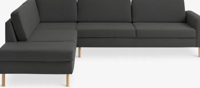 4-personers hjørnesofa i stof. Sæde- og ryghynder i skum. Ben i massiv bøg. Kan ikke spejlvendes. B280 x H81 x D87/226 cm
