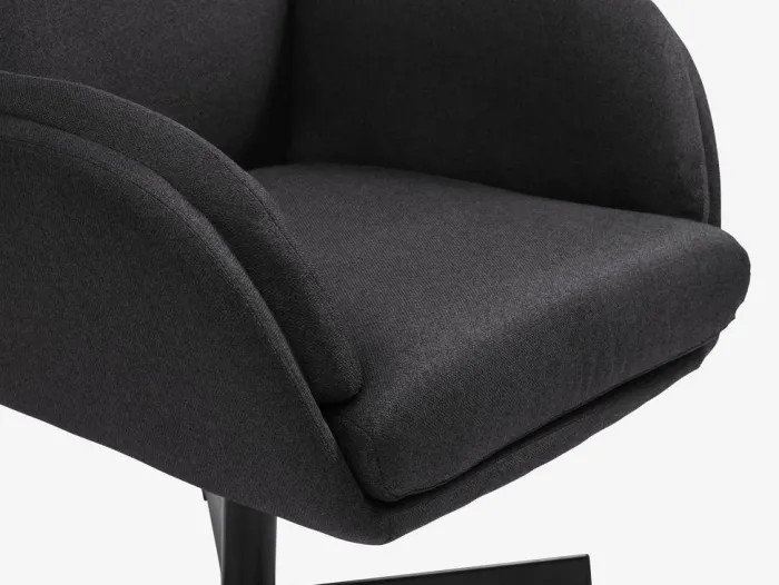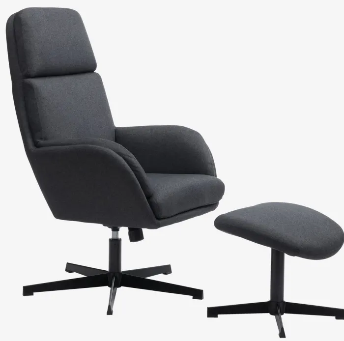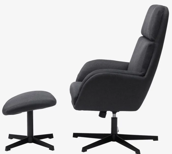 Stof. Sæde- og ryghynder i skum. Med drejefod i stål og trinløs vippefunktion. Inkl. fodskammel. B70 x H107 x D119 cm
