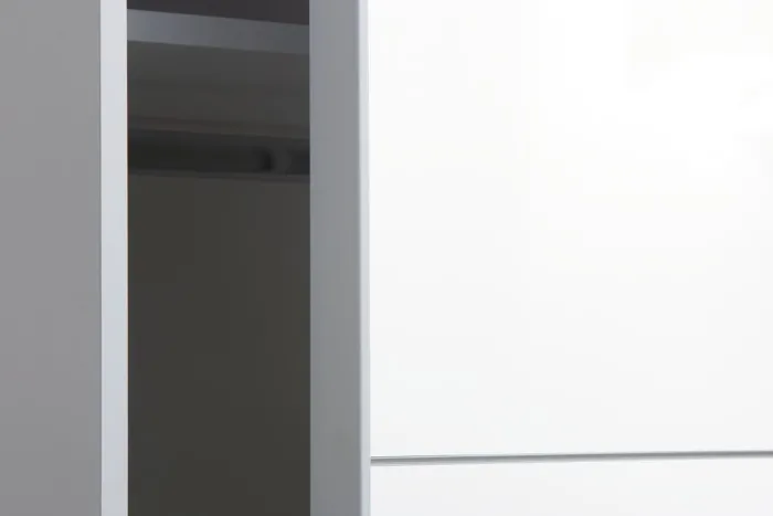 Kunstfiner. Med skydedøre. Skabets indretning: 2 hylder og 2 bøjlestænger. B151 x H201 x D66 cm