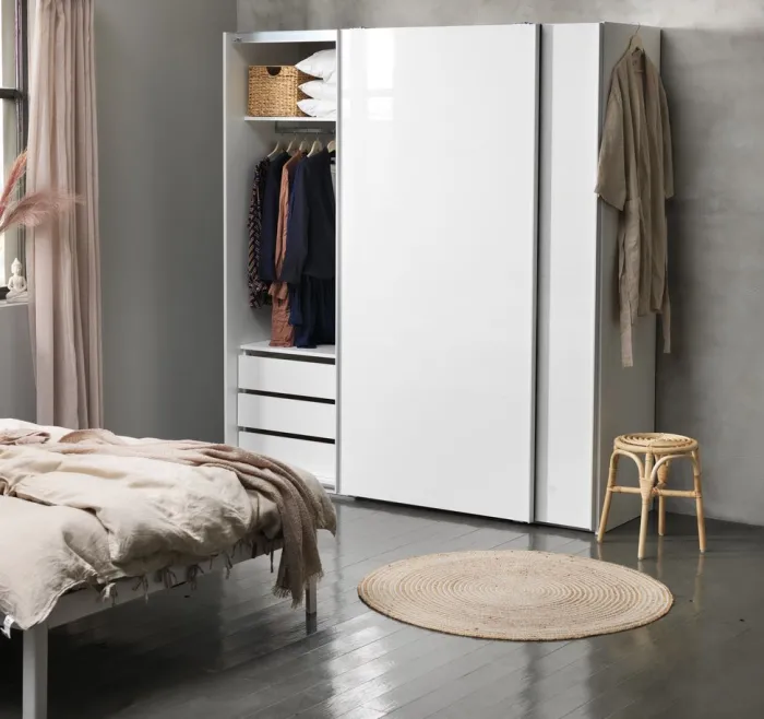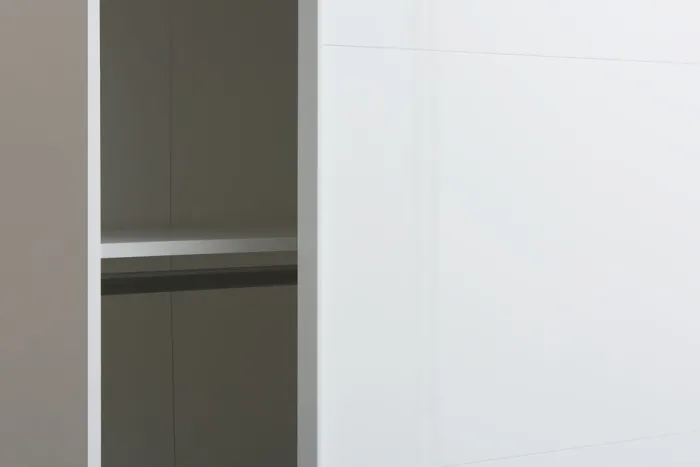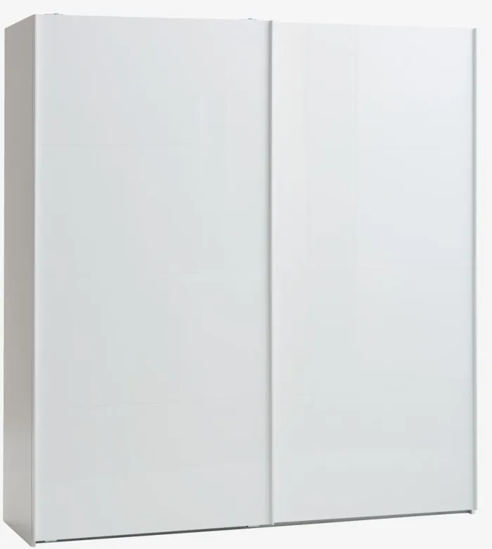 Højglans. Med skydedøre. Skabets indretning: 2 hylder og 2 bøjlestænger. B202 x H221 x D66 cm