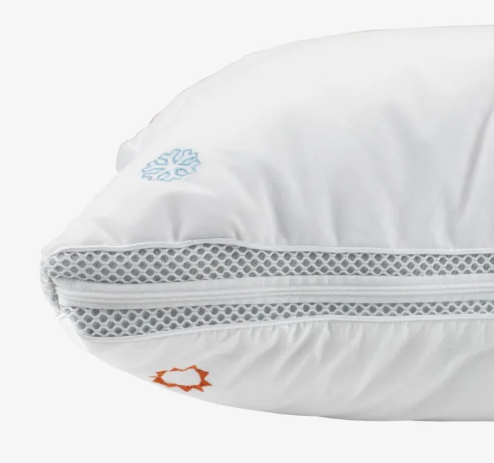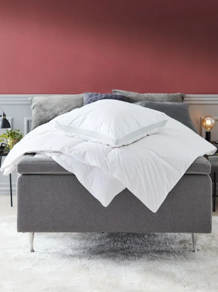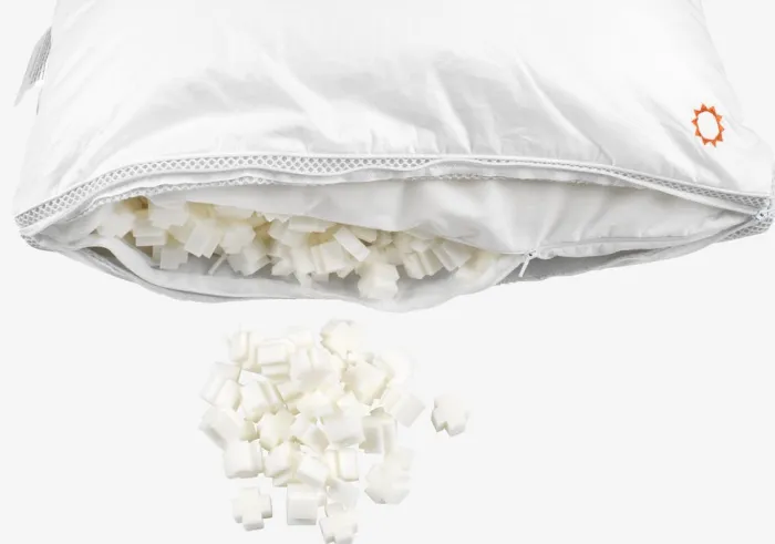 Allergivenlig pude 52x56x16 cm med fyld af 52% fiberdun/48% hvide andedun og -fjer i yderkamrene og 100% små, ensartede stykker trykaflastende AIR memory foam i inderkammeret, 860 g. De jævnt fordelte stykker af memory foam hjælper til at øge luftgennemstrømningen i puden. Pudens højde kan justeres ved at fjerne noget af fyldet. Blødt bolster i 100% bomuldscambric. Det tætvævede bolster begrænser støvmider i at trænge igennem. Bolsterets ene side indeholder kølende og temperaturregulerende TEMPRAKON® rumteknologi, som skaber et tørt og behageligt sovemiljø. Vask 60°C. Inkl. opbevaringstaske.
