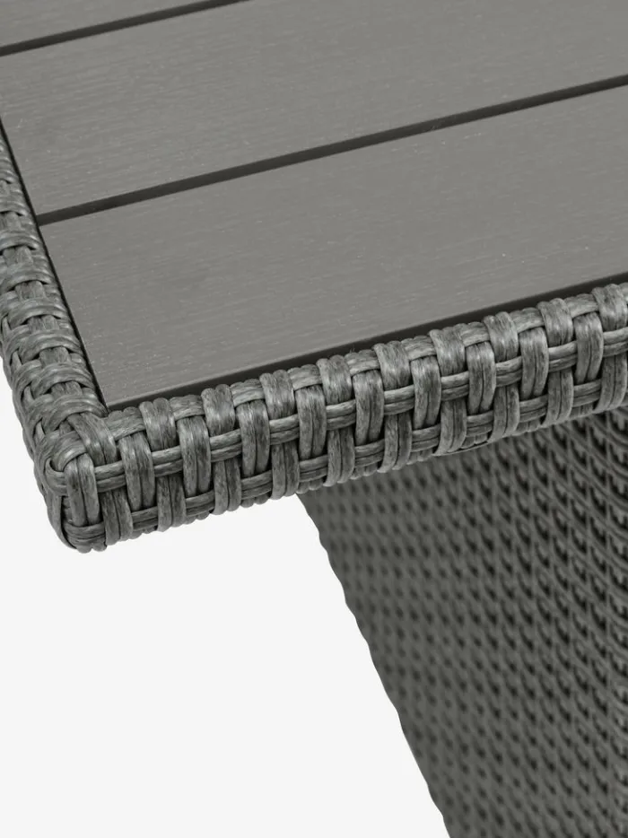 5-personers loungesæt. Bord: Stål, kunsttræ og polyrattan. B75 x L130 x H67 cm. 3-personers sofa og stol: Stål og polyrattan. Inkl. luksushynder med slidstærkt, strukturvævet betræk.
