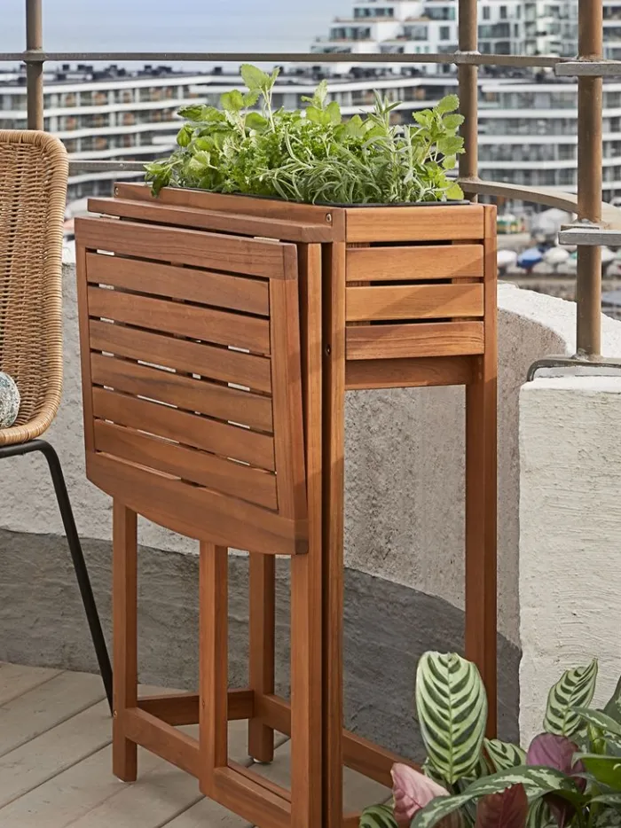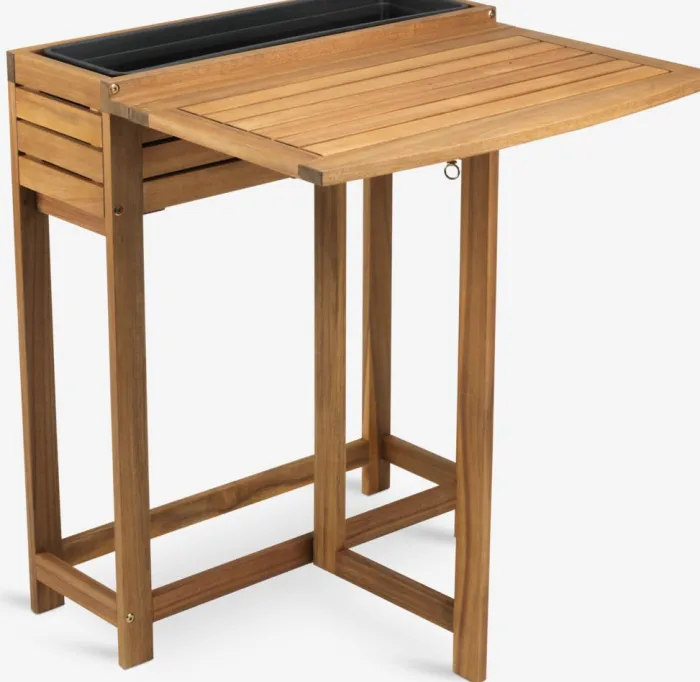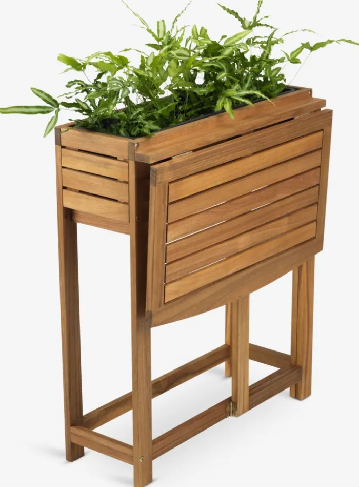 Foldbart bord i olieret FSC® hårdttræ med en indbygget plantekasse til at fremvise dine yndlingsplanter. Dette rektangulære bord er foldbart og ideelt til kompakte altanområder, hvilket giver en praktisk og stilfuld udendørs løsning. B64 x L63 x H77 cm
