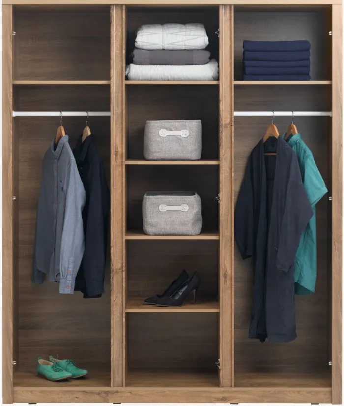 Kunstfiner. Skabets indretning: 6 hylder og 2 bøjlestænger. B167 x H197 x D53 cm