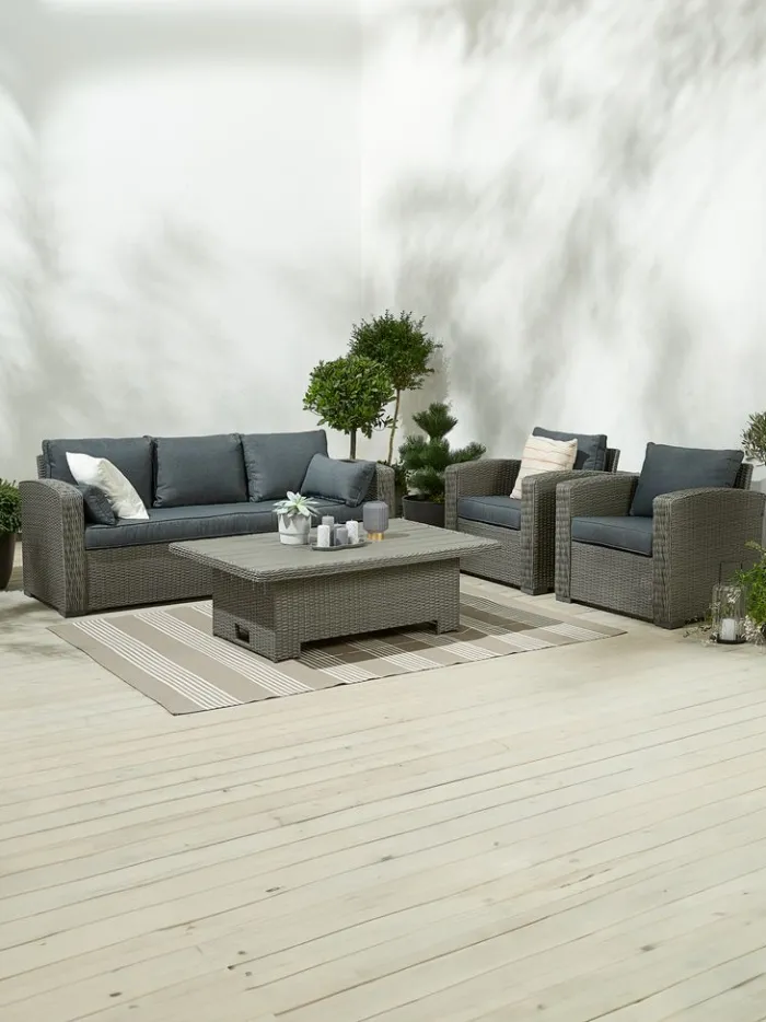 5-personers loungesæt. Bord: Aluminium, kunsttræ og polyrattan. Højdejusterbart. B85 x L134 x H45/68 cm. 3-personers sofa og stol: Aluminium og polyrattan. Inkl. luksushynder med slidstærkt, strukturvævet betræk.