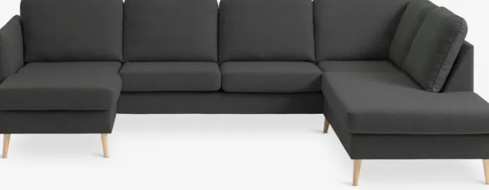6-personers hjørnesofa i stof. Sæde- og ryghynder i skum. Ben i massiv bøg. Kan ikke spejlvendes. B294 x H82 x D82/137/201 cm
