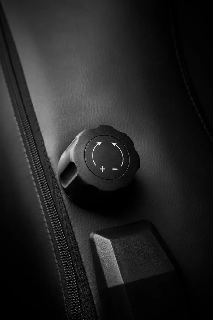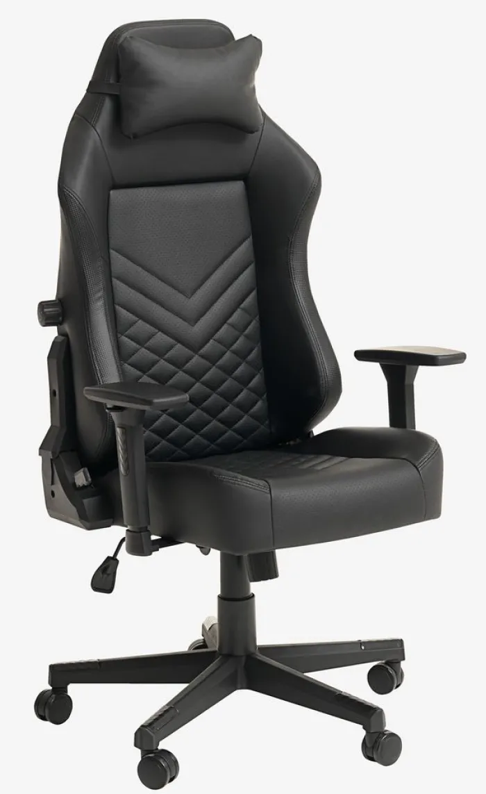 Kunstlæder. Pude til ekstra støtte i nakken. Med justerbar lændestøtte, justerbare armlæn, trinløs vippefunktion og justerbar højde. B70 x H124-133 x D70 cm