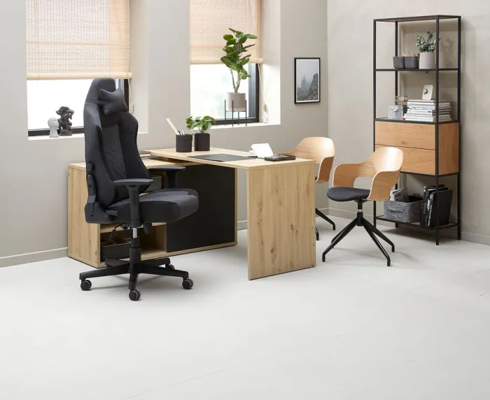 Stof. Pude til ekstra støtte nakken. Med justerbar lændestøtte, justerbare armlæn, trinløs vippefunktion og justerbar højde. B70 x H124-133 x D70 cm
