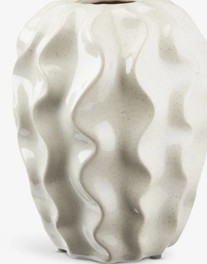 Grå vase i stentøj med et unikt bølgeformet design, der tilføjer et dynamisk og kunstnerisk touch til enhver indretning. Vasen har en glaseret overflade, der giver den et skinnende og elegant udseende. Perfekt som en dekorativ genstand eller til at fremvise blomsterarrangementer. Ø16 x H20 cm