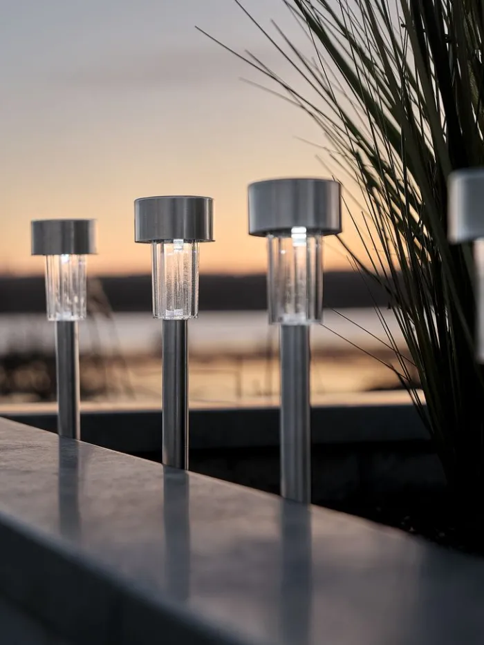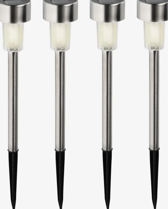 Sæt med 4 solcellelamper i stål med indbygget LED-lys. Disse lamper oplyser dine havegange i 6-8 timer og skaber en indbydende udendørs atmosfære. Hver lampe har et spyd, der nemt kan placeres i jorden. Ø6 x H37 cm