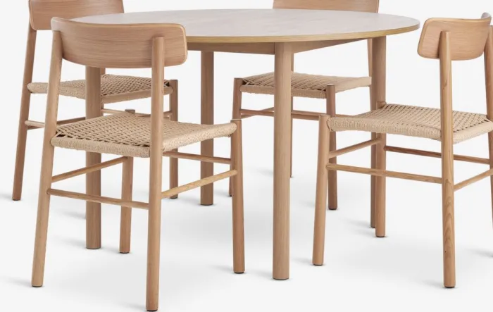 Bord: Kunstfiner og stål. Ø120 x H75 cm. Stol: Papirsnor, massiv eg og egefiner.