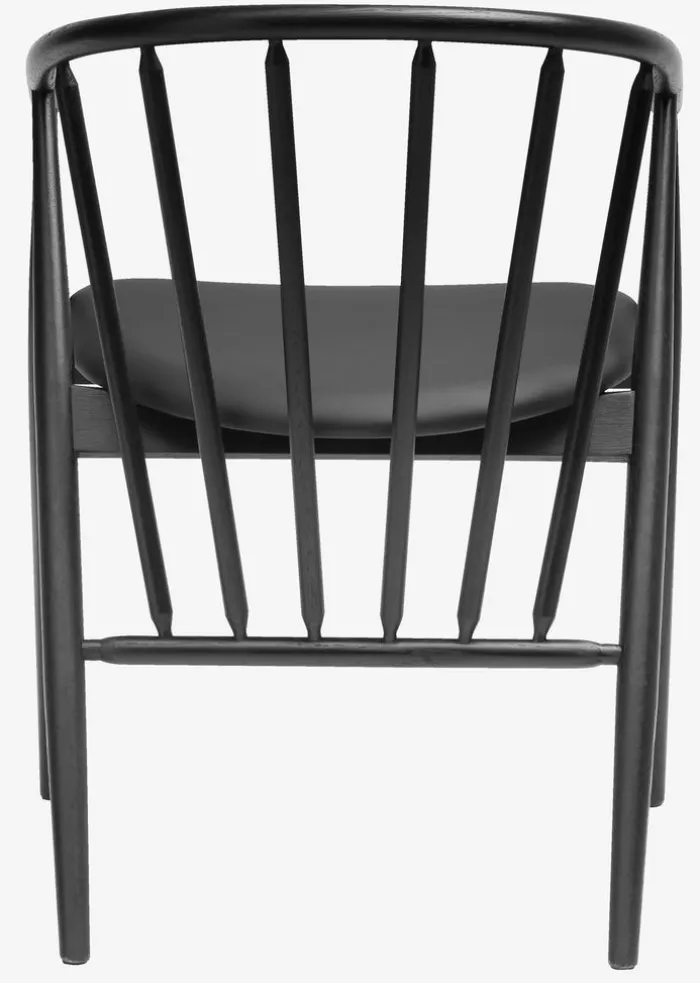 Spisebordsstol med armlæn, der giver ekstra støtte og komfort. Stolen har et polstret sæde i sort kunstlæder. Matchende stel i massiv eg med buet ryglæn.