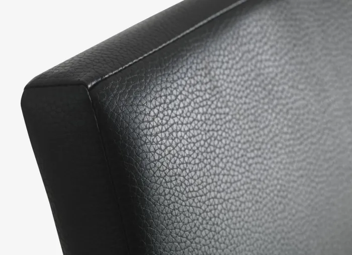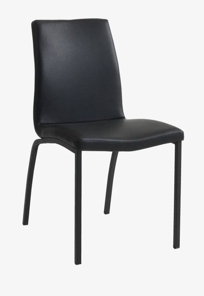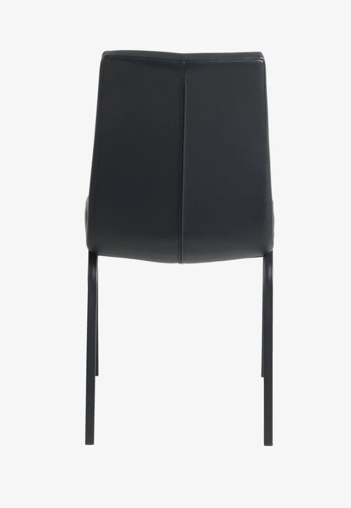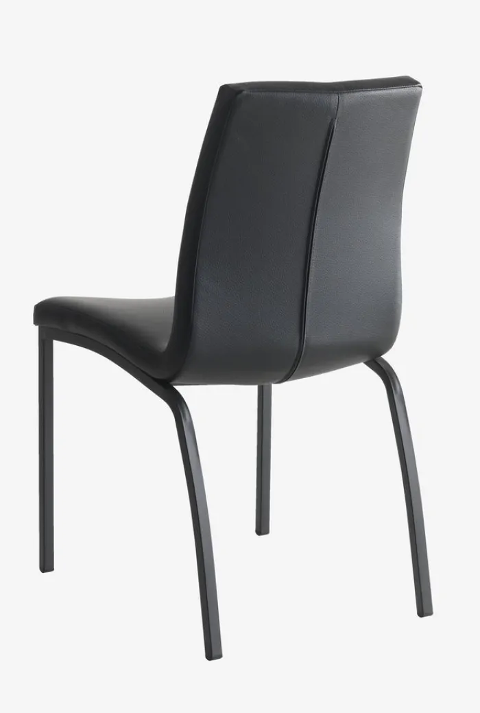 Spisebordsstol med polstret sæde og ryglæn i sort kunstlæder. Matchende ben i stål.