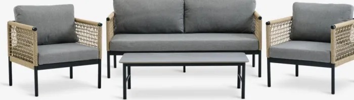 BAMLE loungesæt består af en loungesofa med plads til 2,5 personer, 2 loungestole og et loungebord. De matchende loungemøbler kan komfortabelt rumme 4 til 5 personer.