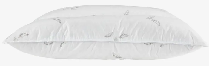 Andedunspude 60×63/70 cm med 4 kamre. Fyld af 50% hvide andedun/50% andefjer i yderkamrene og 85% hvide andefjer/15% andedun i inderkamrene, 820 g. Bolster i 100% bomuldscambric. Bæreevne 350/300. Vask 60°C.