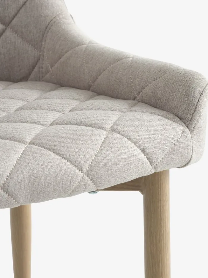Spisebordsstol med polstret sæde og ryglæn i sandfarvet stof. Ben i stål med egetræslook.