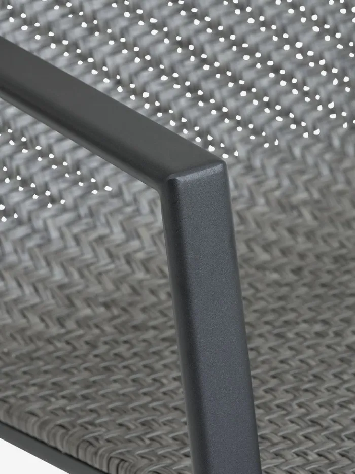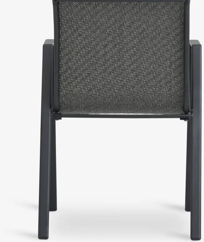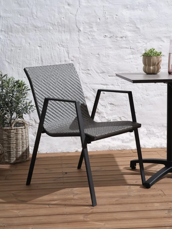 Grå stabelstol med sæde i polyrattan og stel i pulverlakeret stål. Polyrattan giver et naturligt fletlook, samtidig med at det er vejrbestandigt og vedligeholdelsesfrit. Havestolen kan stables for kompakt opbevaring.