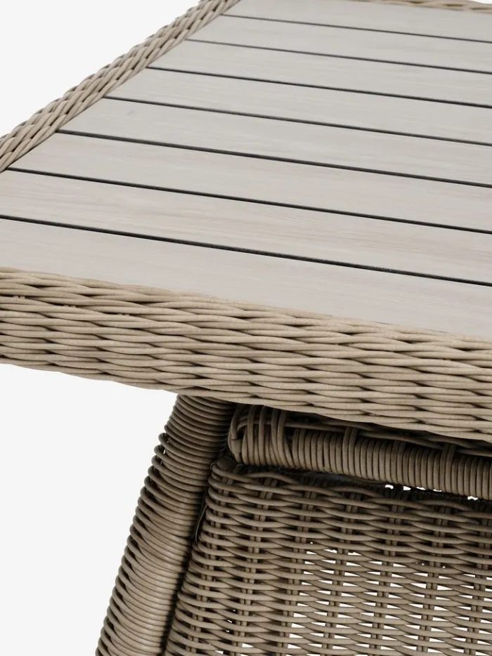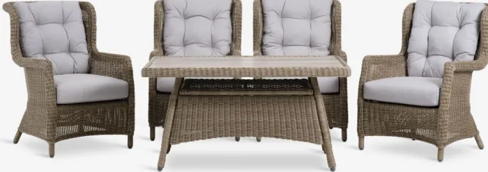 4-personers loungesæt. Bord: Aluminium, DURAWOOD® komposittræ og polyrattan. DURAWOOD® er et slidstærkt sammensat materiale, bestående af FSC®-hårdttræsfibre og plast. B84 x L127 x H65 cm. Stol: Aluminium og polyrattan. Inkl. luksushynder med slidstærkt, strukturvævet betræk.