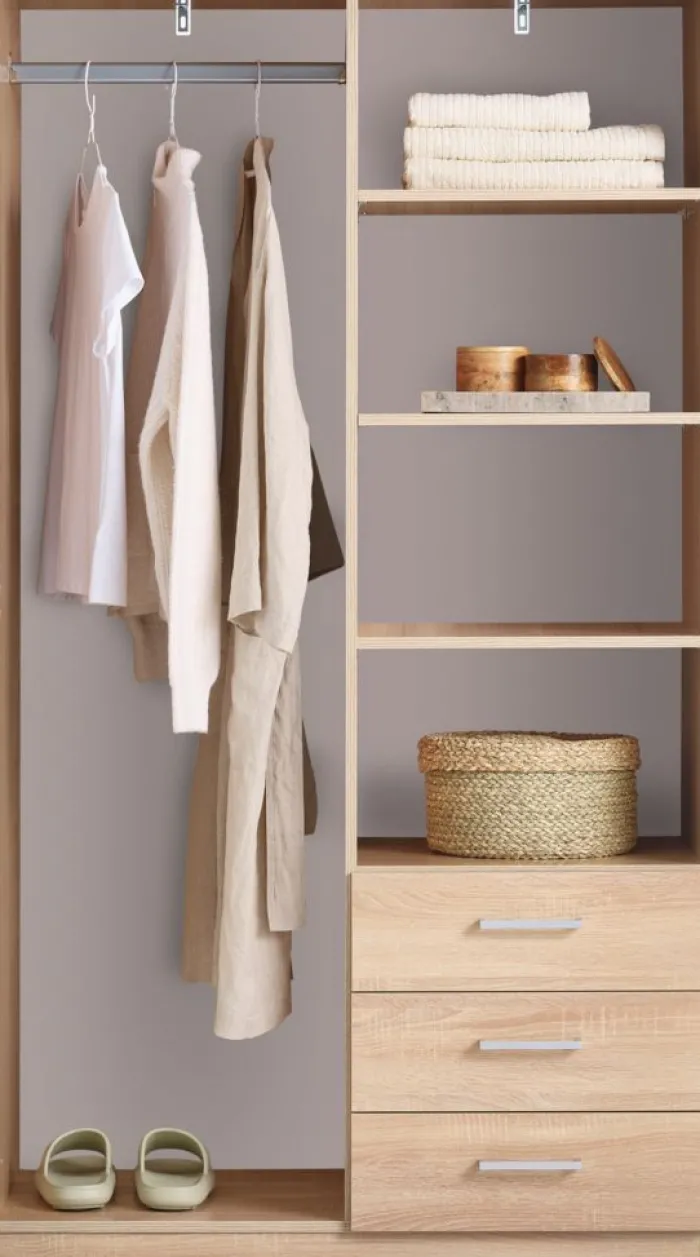 Kunstfiner. Skabets indretning: 3 hylder og 1 bøjlestang. B97 x H176 x D50 cm