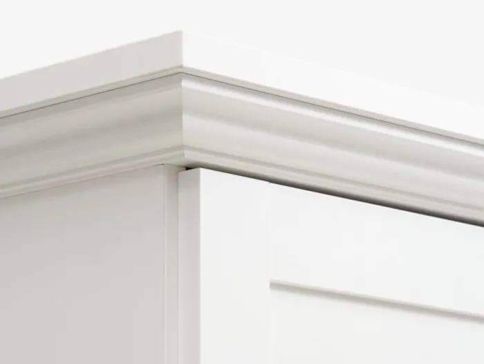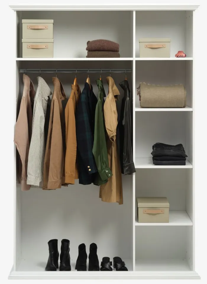 Kunstfiner. Skabets indretning: 5 hylder og 1 bøjlestang. B140 x H200 x D64 cm