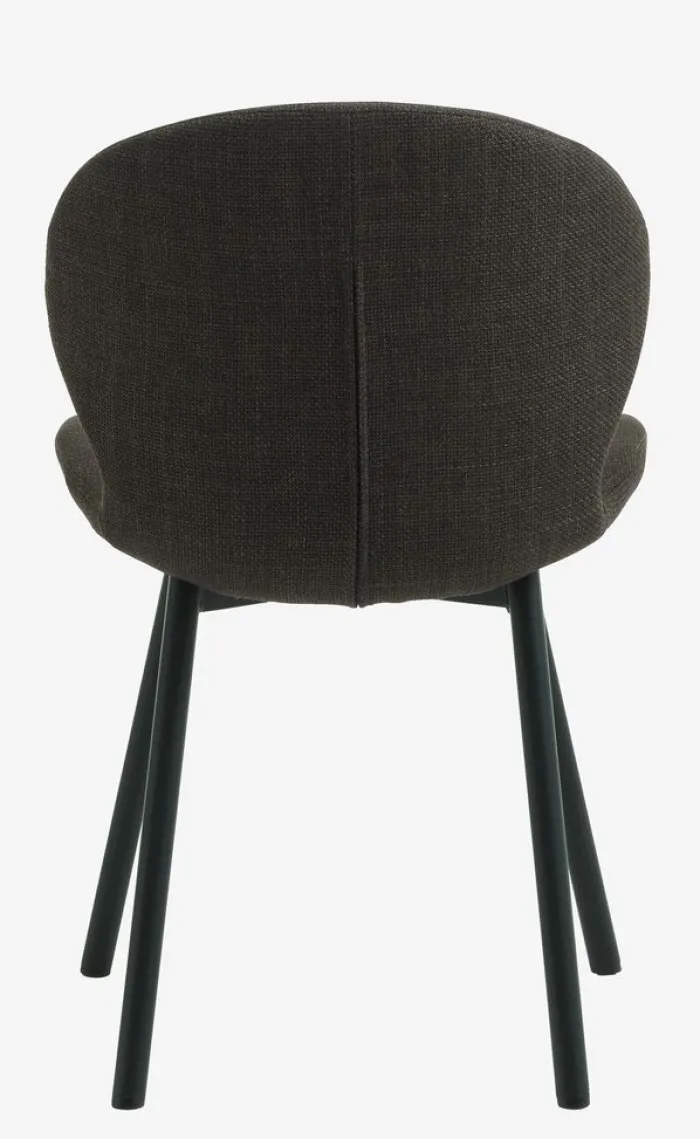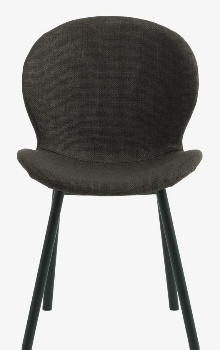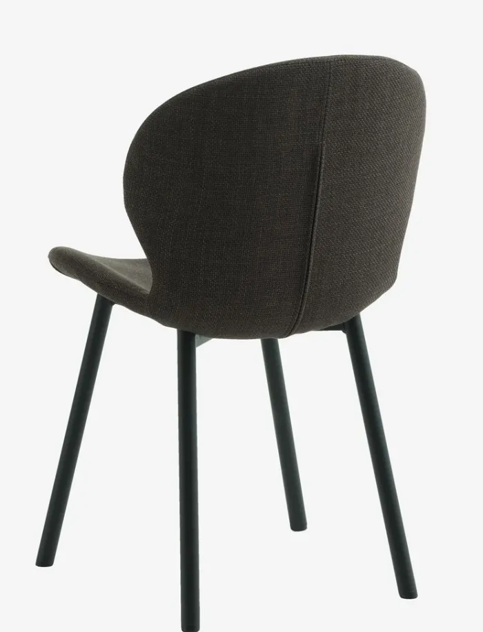 Spisebordsstol med polstret sæde og ryglæn i mørkebrunt stof. Sorte ben i stål.