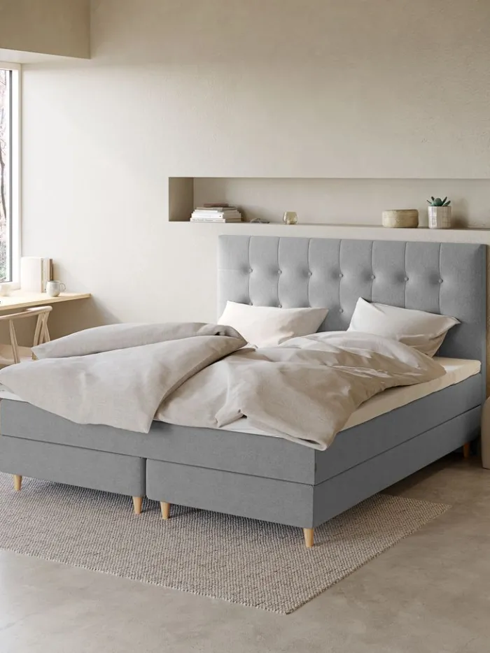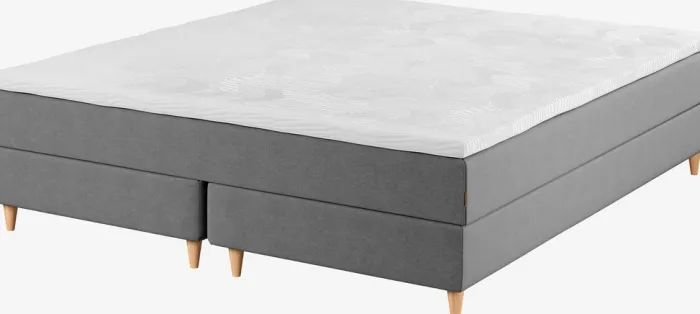 Kontinentalseng 180×200 cm. 1 vendbar springmadras med pocket-fjedre 225/m², polstret med purskum. Madrassen er inddelt i 7 komfortzoner hvilket giver en unik, ergonomisk korrekt støtte. 1 topmadras, 6 cm tyk med kerne af trykaflastende gel-skum, der behageligt tilpasser sig kroppen. Vaskbart betræk i 100% polyester (76% genanvendt). Basen består af 2 boxmadrasser. Inkl. ben. Ekskl. gavl.