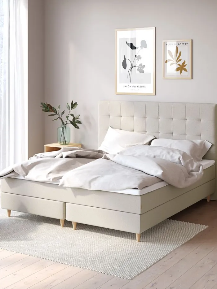 Kontinentalseng 180×200 cm. 1 vendbar springmadras med pocket-fjedre 225/m², polstret med purskum. Madrassen er inddelt i 7 komfortzoner hvilket giver en unik, ergonomisk korrekt støtte. 1 topmadras, 6 cm tyk med kerne af fleksibelt Comfort+ skum, der behageligt tilpasser sig kroppen. Vaskbart betræk i 100% polyester (76% genanvendt). Basen består af 2 boxmadrasser. Inkl. ben. Ekskl. gavl.