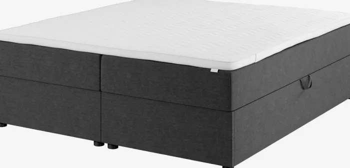 Kontinentalseng 180×200 cm. 2 springmadrasser med pocket-fjedre 233/m², polstret med purskum. 1 topmadras, 6 cm tyk med kerne af trykaflastende memory foam, der former sig præcist efter kroppen. Vaskbart betræk med blød, kraftig quiltning. Basen består af 2 rammer. Med opbevaringsplads. Inkl. ben. Ekskl. gavl.