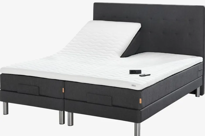 Elevationsseng 180×200 cm med trådløs fjernbetjening. 2 springmadrasser med pocket-fjedre 250/m², polstret med purskum. Madrasserne er inddelt i 7 komfortzoner, hvilket giver en unik, ergonomisk korrekt støtte. 1 topmadras, 8 cm tyk med praktisk snit i hovedenden. Med denne topmadras undgår du revnen mellem sengene, og snittet gør at hovedenderne kan bevæge sig uafhængigt af hinanden. Madrassen har kerne af trykaflastende memory foam, der former sig præcist efter kroppen. Vaskbart strækbetræk med blød, kraftig quiltning. 2 elevationsbunde. Inkl. ben. Ekskl. gavl.
