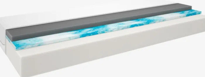 22 cm tyk skummadras 90×200 cm med kerne af 2.5 cm fleksibelt Comfort+ skum, 15.5 cm purskum og 4 cm trykaflastende AIR memory foam med fugtabsorberende bambus trækul. AIR memory foam former sig præcist efter kroppen, selv i et køligt sovemiljø. Vaskbart betræk. Betrækket har fået en antimidebehandling, som hjælper med at begrænse mængden af støvmider.