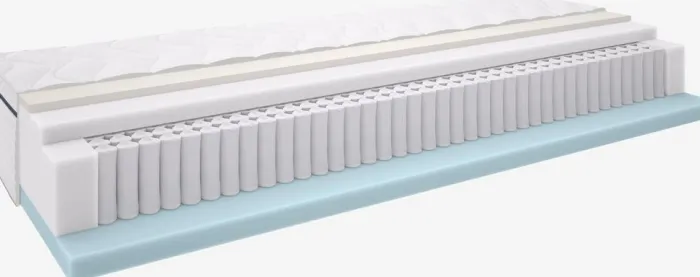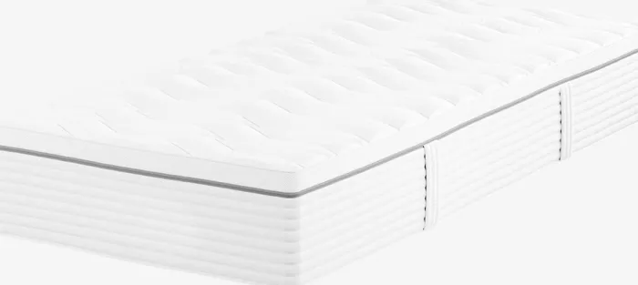 27 cm tyk springmadras 90×200 cm pocket-fjedre 505/m², inddelt i 7 komfortzoner, hvilket giver en unik, ergonomisk korrekt støtte. Madrassen er polstret med åndbar latex og koldskum på den ene side og purskum på den anden. Latex leder effektivt overskydende varme væk. Vaskbart strækbetræk med blød, kraftig quiltning.