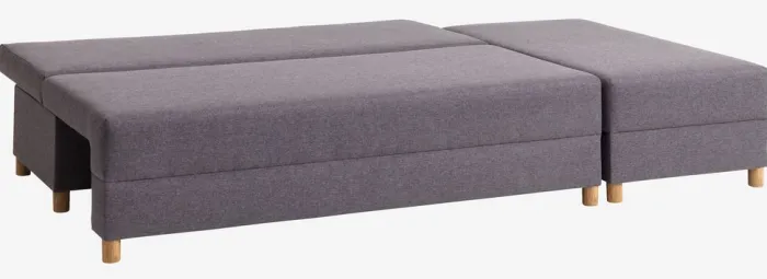 3-personers sofa i stof. Sofaen kan nemt laves om til en seng. Sæde- og ryghynder i skum. Med opbevaringsplads. Kan spejlvendes. Udslået liggemål 110×213 cm. B214 x H69 x D81/122 cm