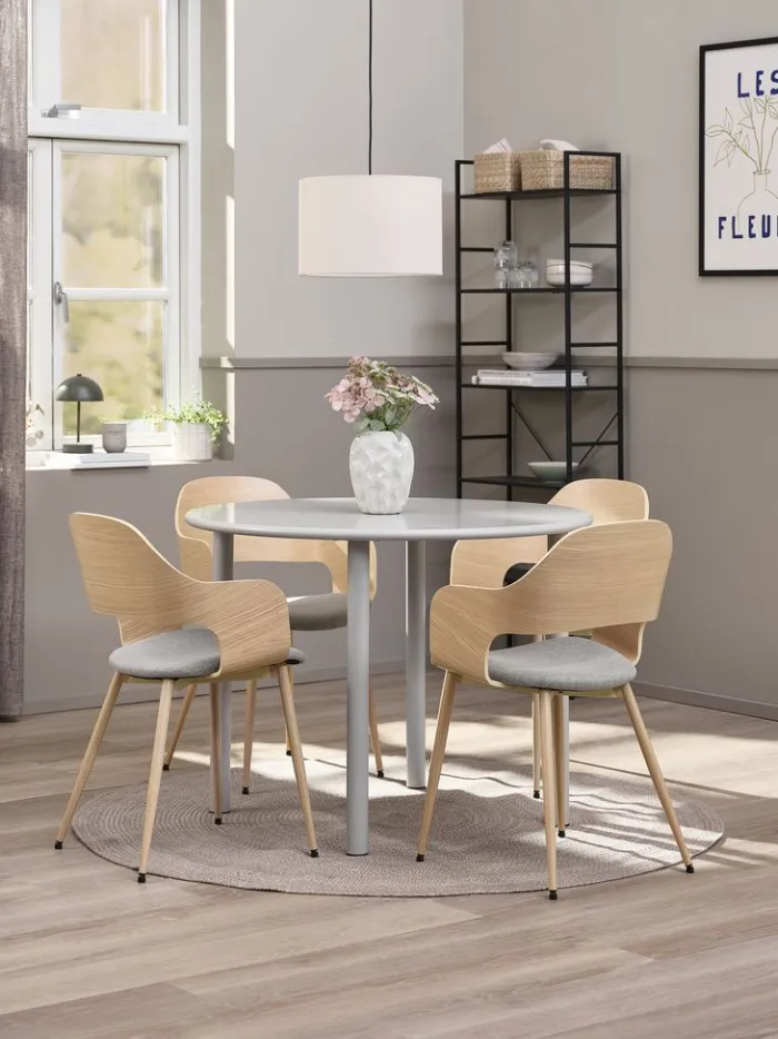 HANSTED + HVIDOVRE Spisebordssæt|HANSTED Ø100 bord grå + 4 HVIDOVRE stole lys eg