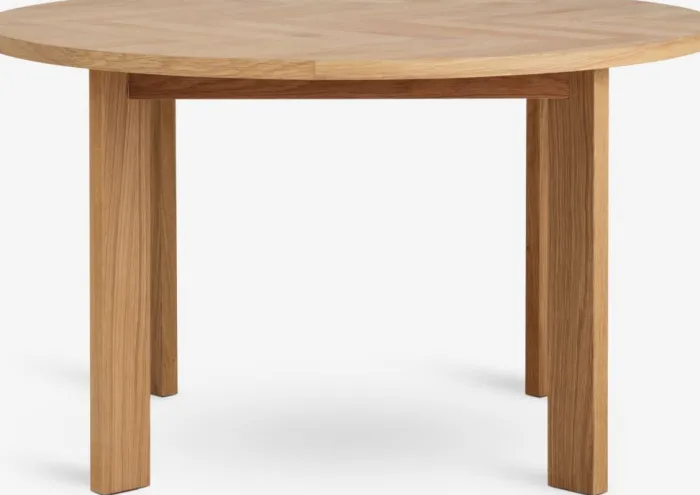 Rundt spisebord med bordplade i egefiner og ben i massiv eg og egefiner. Bordpladen har et elegant sildebensmønster. Ø129 x H75 cm
