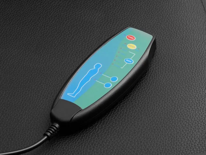 Kunstlæder. Stolen giver vibrerende massage med to indstillinger for styrke og 5 for massagetype. Med trinløs vippefunktion og indbygget benstøtte. B75 x H73-101 x D92-160 cm