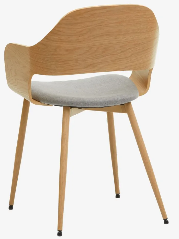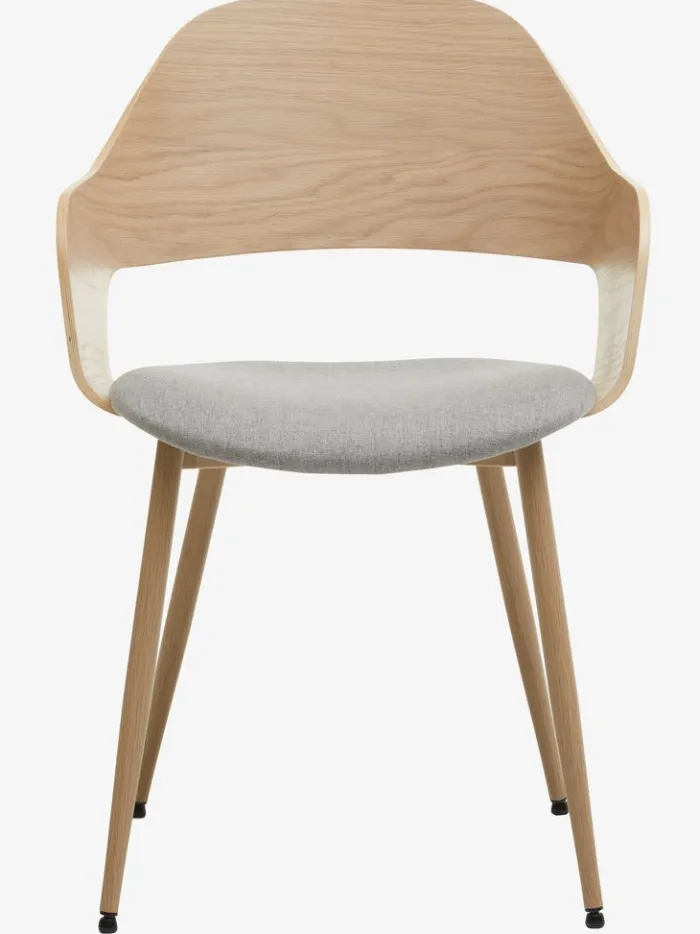 Spisebordsstol med armlæn, der giver ekstra støtte og komfort. Stolen har et polstret sæde i lysegråt stof og et buet ryglæn i lys egefiner. Træet er lakeret for at forlænge holdbarheden. Ben i stål med egetræslook.