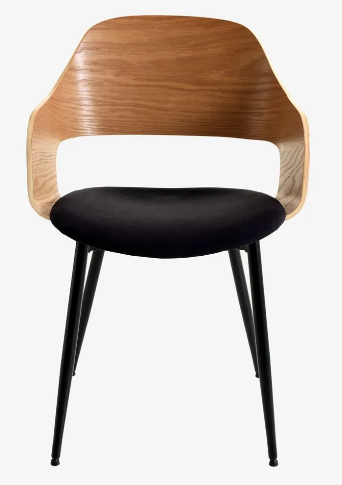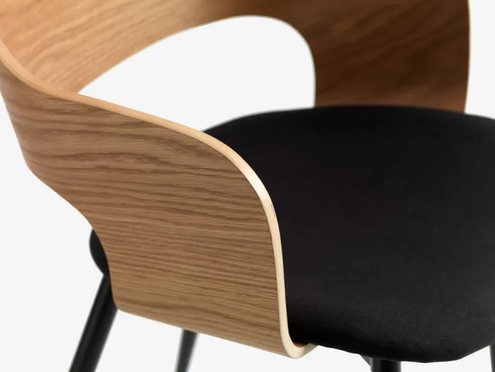 Spisebordsstol med armlæn, der giver ekstra støtte og komfort. Stolen har et polstret sæde i sort stof og et buet ryglæn i egefiner. Træet er lakeret for at forlænge holdbarheden. Sorte ben i stål.