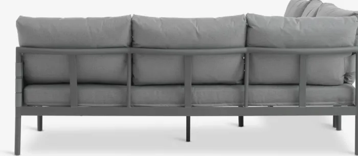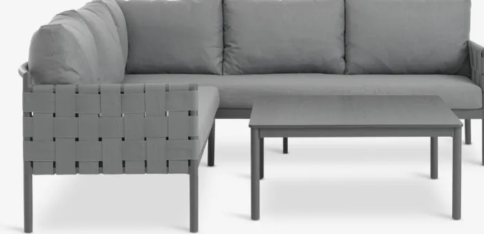 5-personers loungesæt. Bord: Aluminium og DURAWOOD® komposittræ. DURAWOOD® er et slidstærkt sammensat materiale, bestående af FSC®-hårdttræsfibre og plast. B86 x L86 x H39 cm. 5-personers sofa: Aluminium og UV-beskyttet polypropylen. Kan ikke spejlvendes. Inkl. luksushynder med slidstærkt, strukturvævet betræk.