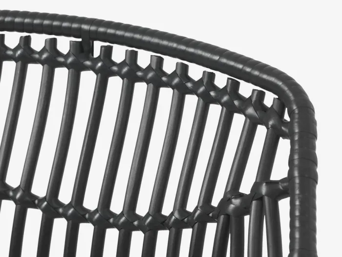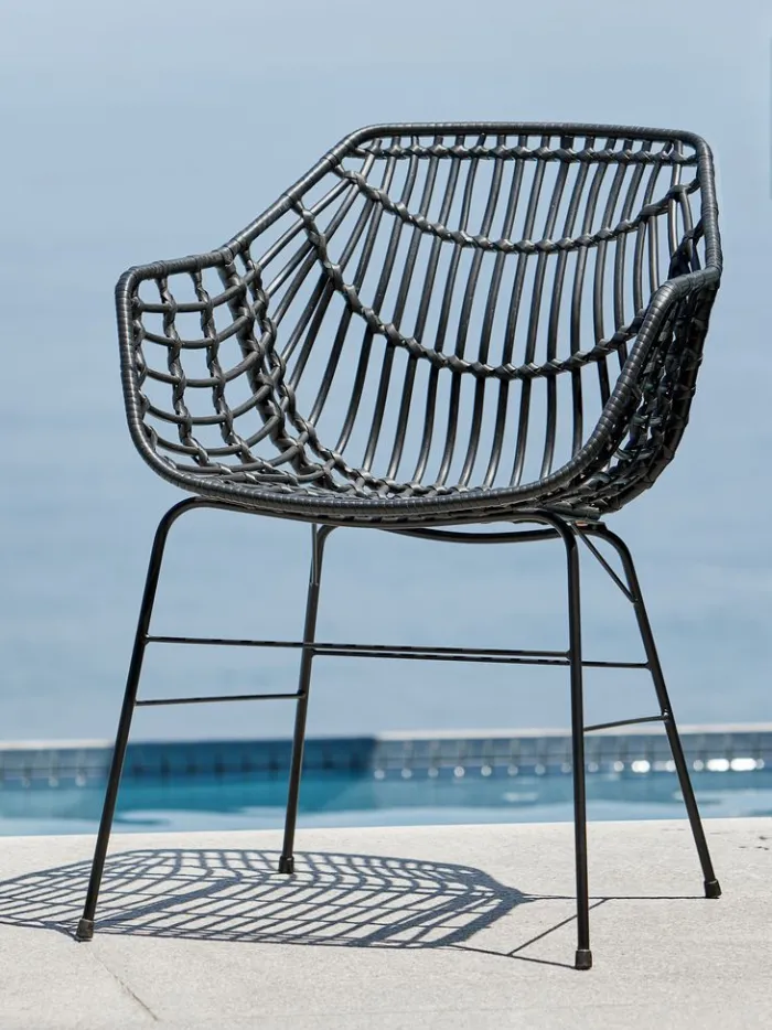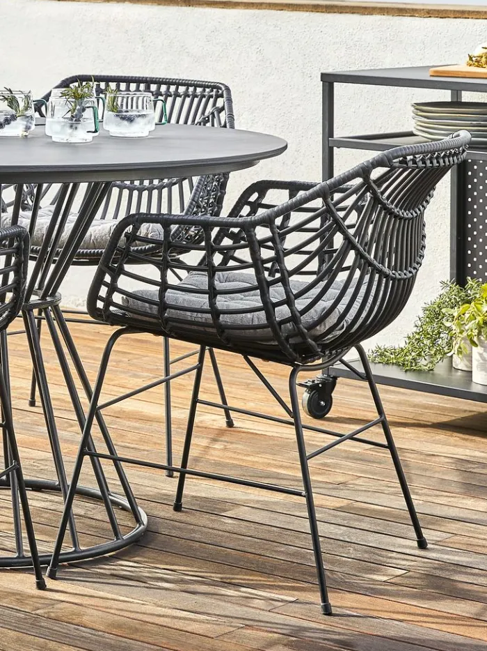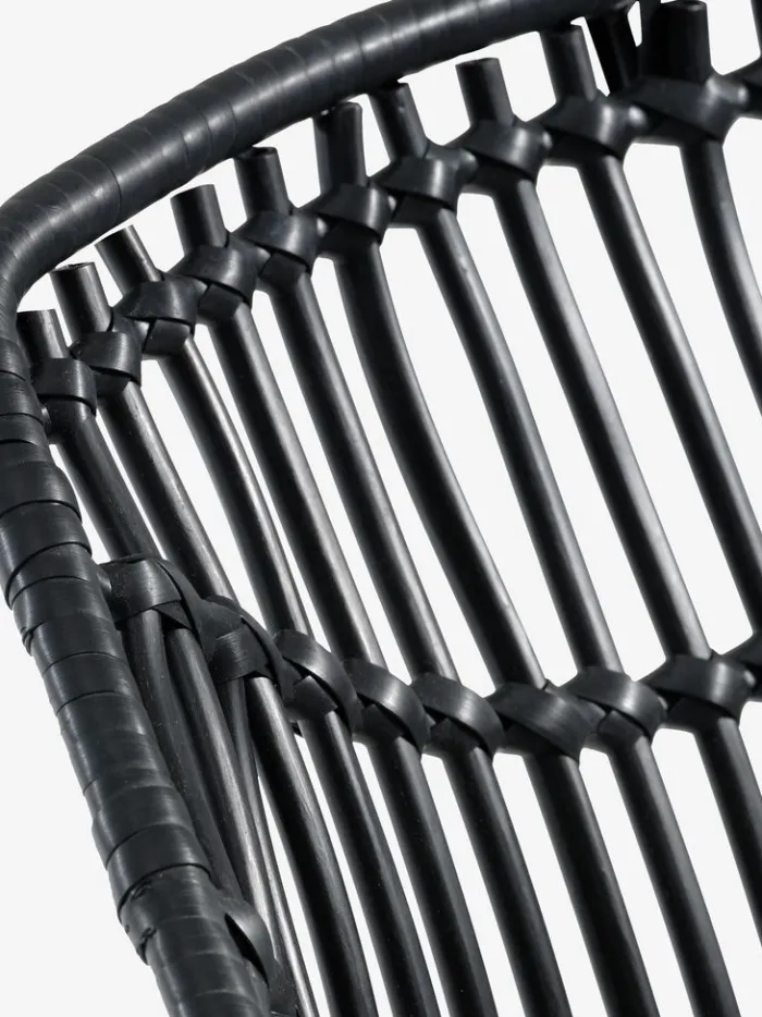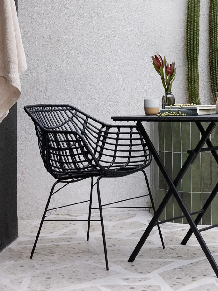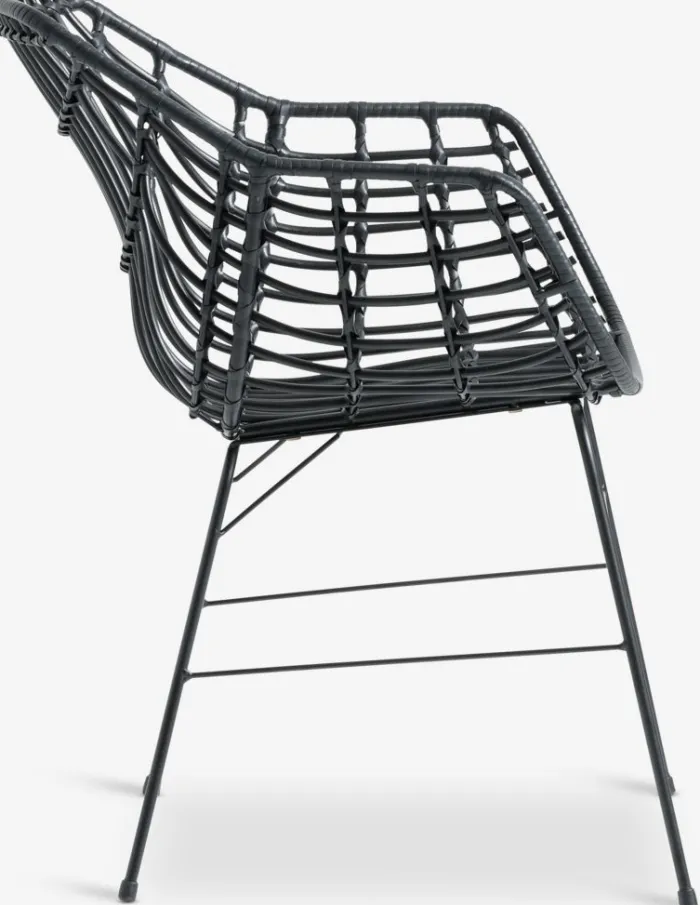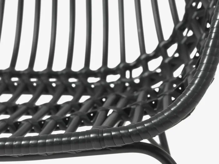 Sort havestol med sæde og ryglæn i polyrattan og matchende ben i pulverlakeret stål. Polyrattan giver et naturligt fletlook, samtidig med at det er vejrbestandigt og vedligeholdelsesfrit.