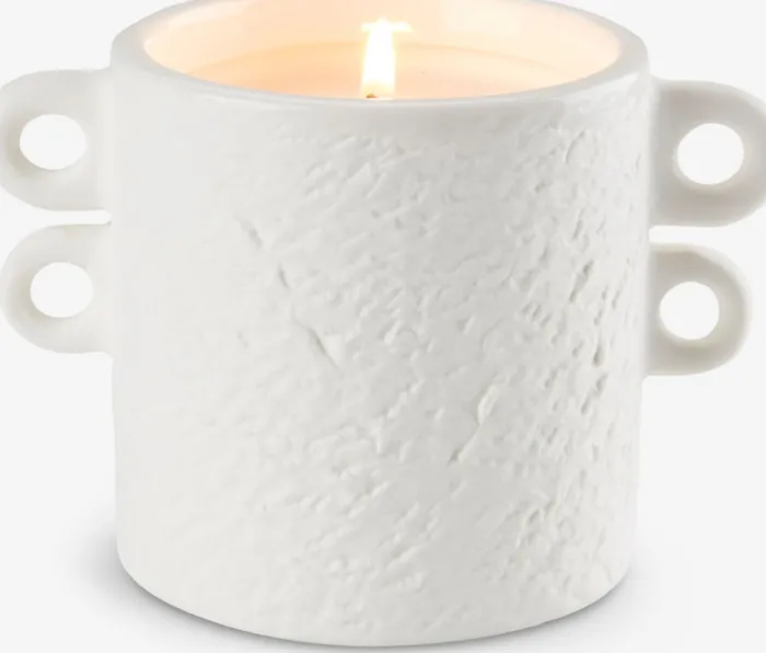 Råhvidt stearinlys med en unik, struktureret overflade. Lyset har to dekorative håndtag, som tilføjer en moderne detalje til designet. Perfekt til at skabe en hyggelig atmosfære i hjemmet. Ø8 x H8 cm