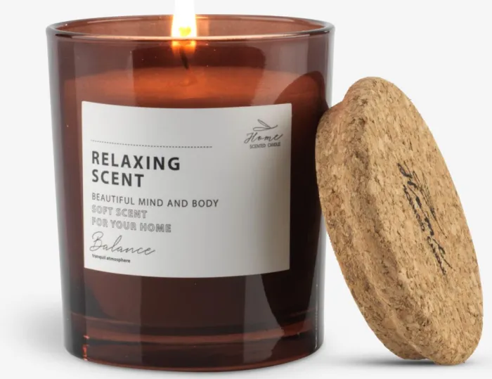 Brunt duftlys med hvid etiket og korklåg. Lyset er parfumeret og har en brændetid på 25 timer. Ø7 x H8 cm