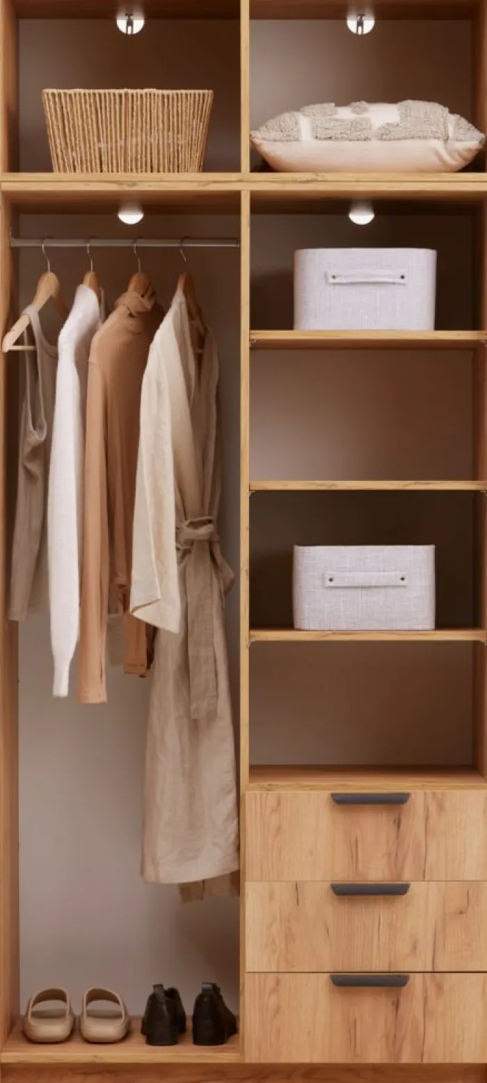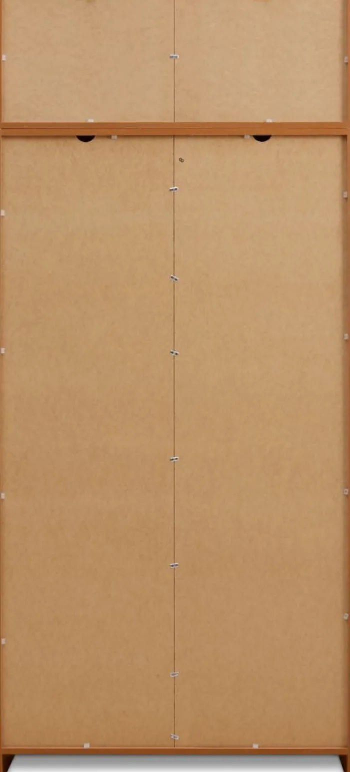 Kunstfiner. Skabets indretning: 4 hylder og 1 bøjlestang. B96 x H176 x D50 cm