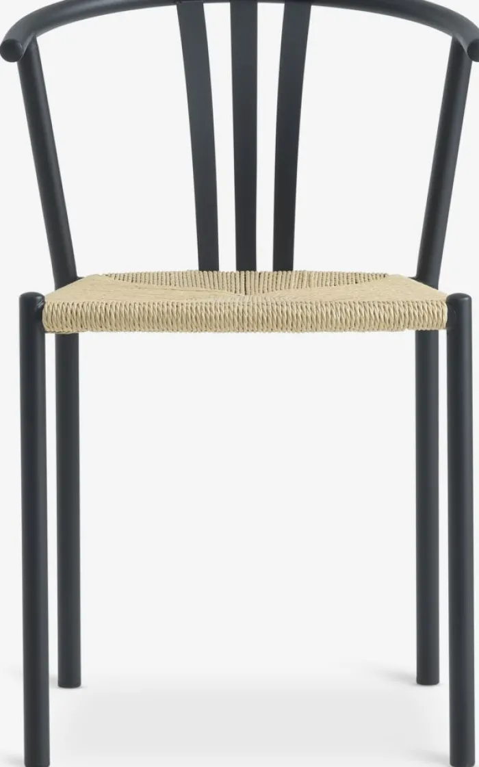 Spisebordsstol med sæde i vævet papirsnor. Sort stel i stål med buet ryglæn.