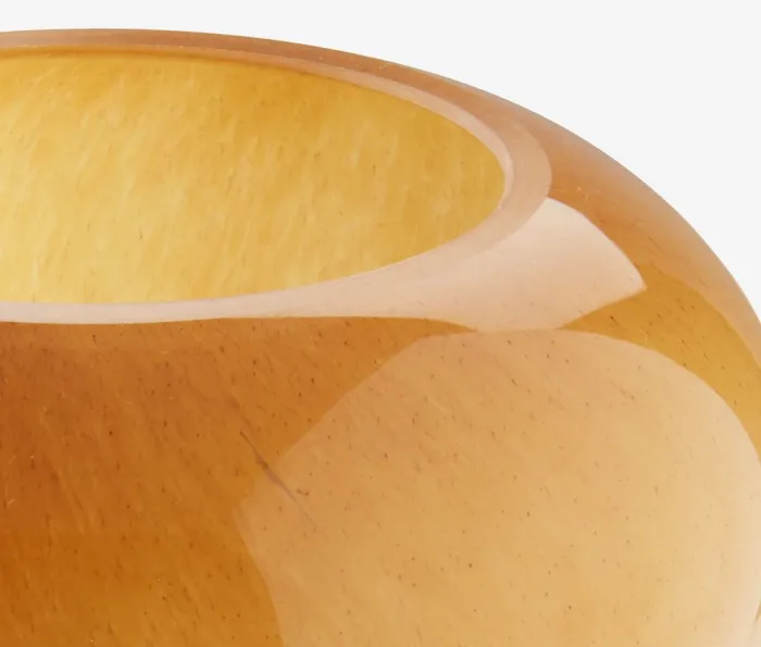 Gul vase i glas med en unik form, der kombinerer en bred, afrundet top med en slank, cylindrisk base. Vasen har en glat og skinnende overflade, der fremhæver dens moderne design og gør den til et iøjnefaldende element i din boligindretning. Ø19 x H25 cm
