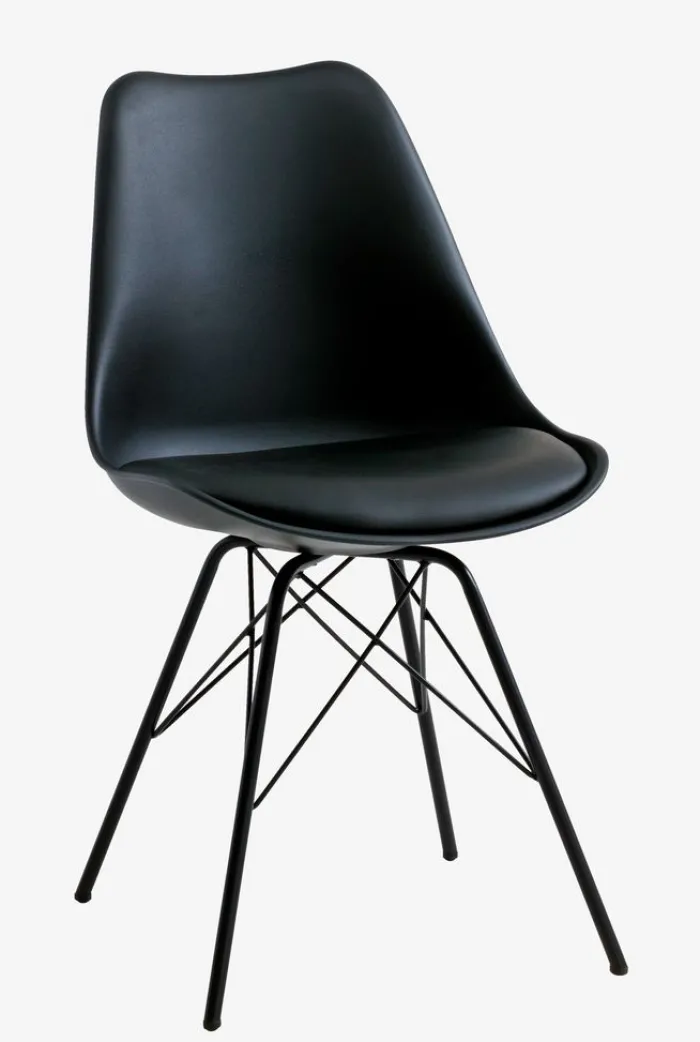 Spisebordsstol med sort formstøbt sæde og fastgjort hynde i kunstlæder. Matchende ben i stål.