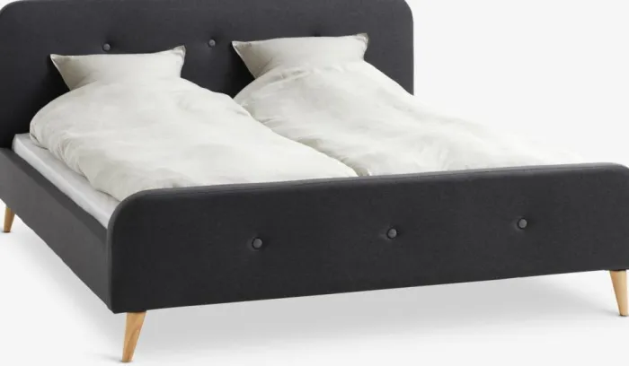 Stof og massivt træ. Passer til box-, spring- og skummadrasser 140×200 cm. Ekskl. bund og madras. B156 x L216 x H101 cm