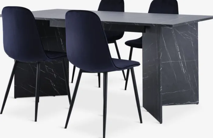 KRONDAL + BISTRUP Spisebordssæt|KRONDAL L180 bord marmor + 4 BISTRUP mørkeblå velour