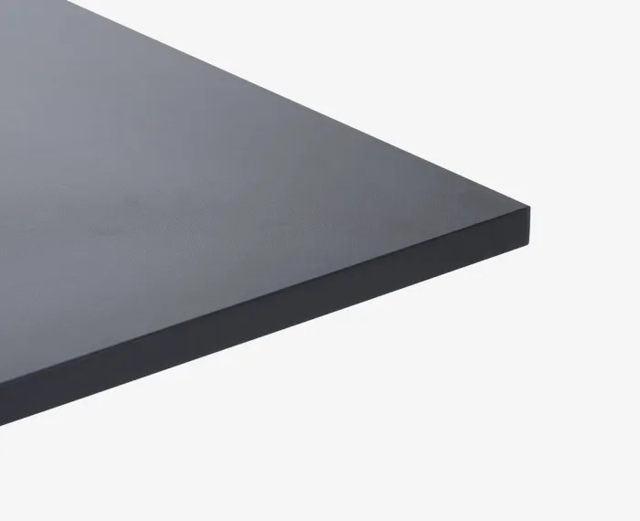 Kunstfiner og stål. Ledningsfrit hæve sænkebord, som betjenes med gaslift. B70 x L130 x H71-117 cm