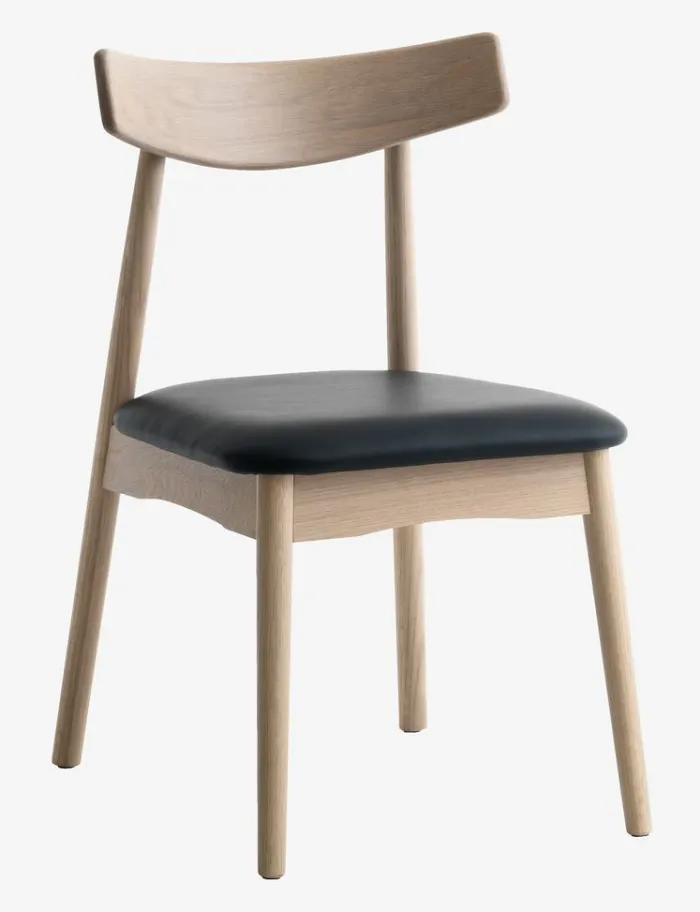 Spisebordsstol med polstret sæde i sort kunstlæder og stel i massiv eg. Træet er lakeret for at forlænge holdbarheden.